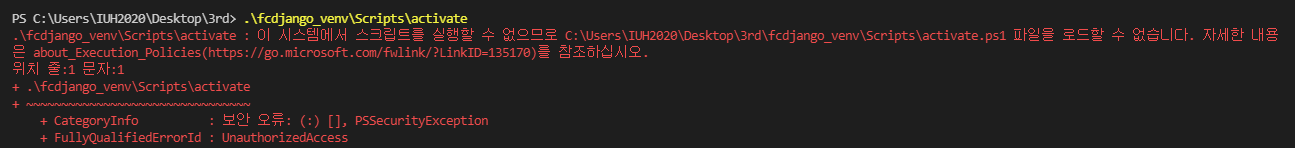 시스템에서 스크립트를 실행할 수 없으므로 evenv\Scripts\activate.ps1 파일을 로드할 수 없습니다. 자세한 내용